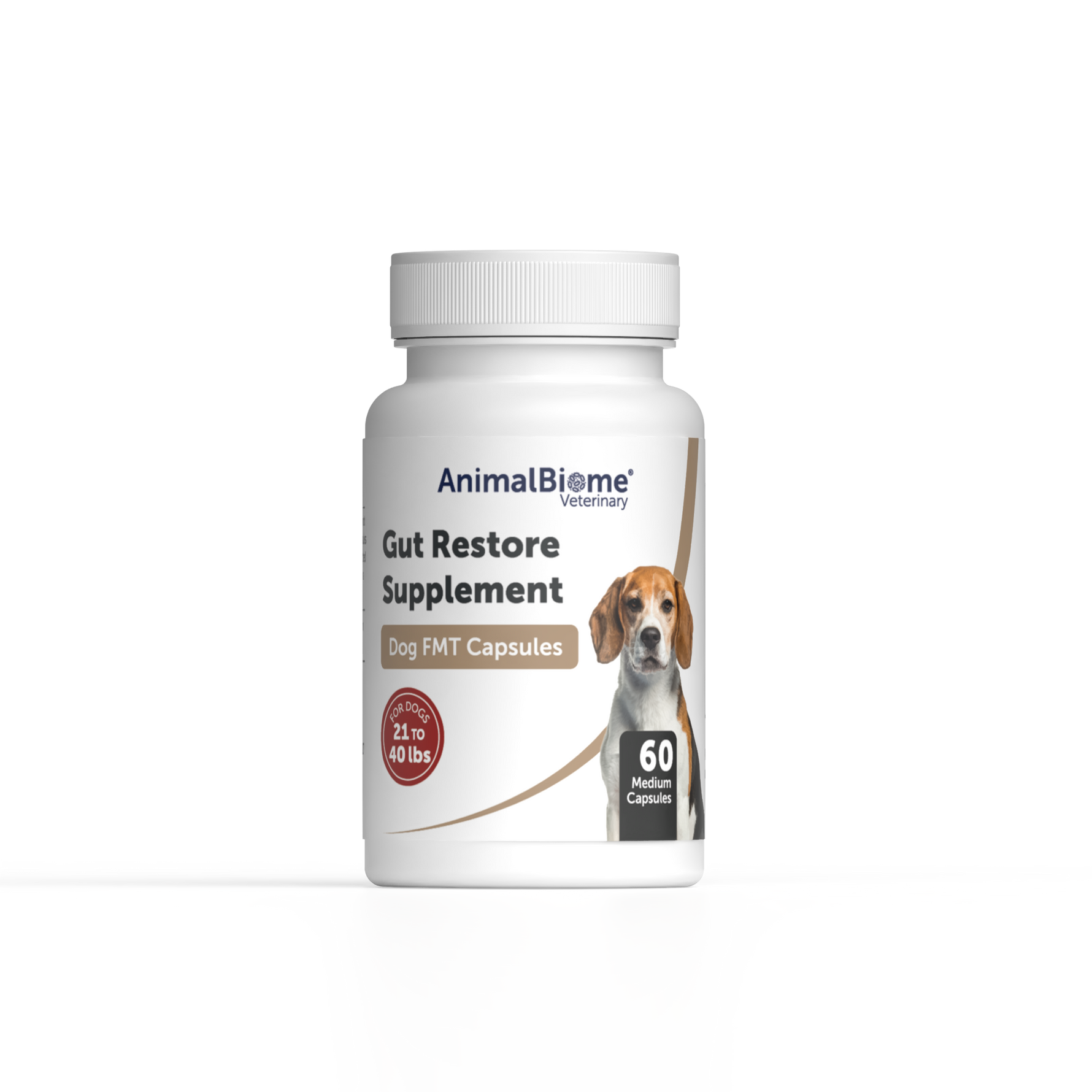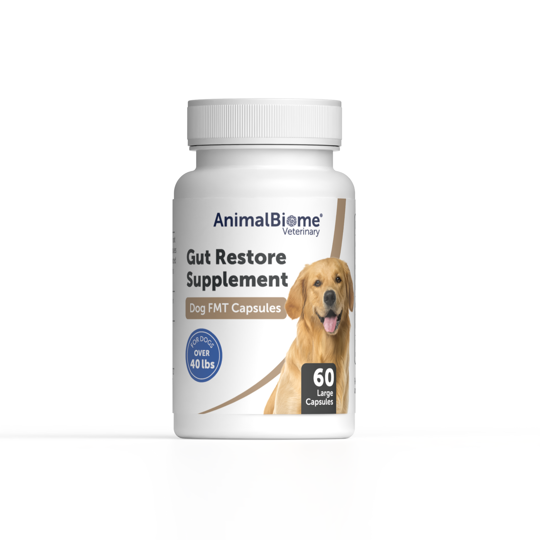 Gut Restore Supplement for Dogs is a unique, capsule-based fecal microbiota transplant (FMT) that restores gut balance using dog-specific microbes. This convenient, non-invasive alternative to surgical FMT seeds the gut with beneficial microbes to restore the gut to a more balanced state, proving more effective than standard probiotics.