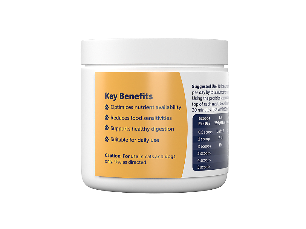 Using the provided clear scoop and dosing chart, add the recommended quantity of powder to the top of food at each meal. Discard uneaten food after 30 minutes.