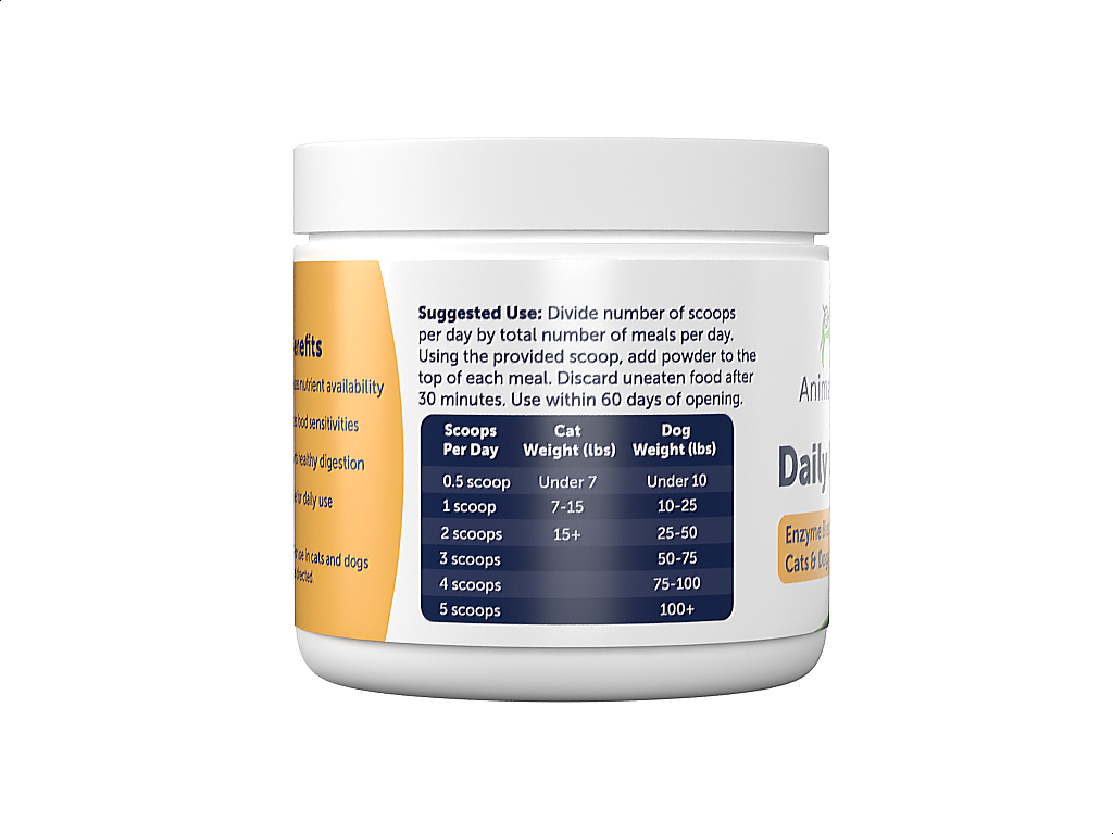 Daily Digest is a flavorless, full-spectrum blend of digestive enzymes, including amylase, lipase, cellulase, papain, and bromelain. These enzymes assist in breaking down proteins, fats, carbohydrates, and plant fibers, enhancing the bioavailability of nutrients from your patient’s food.